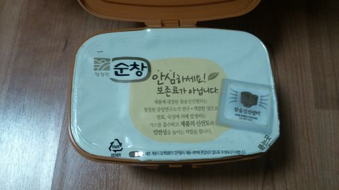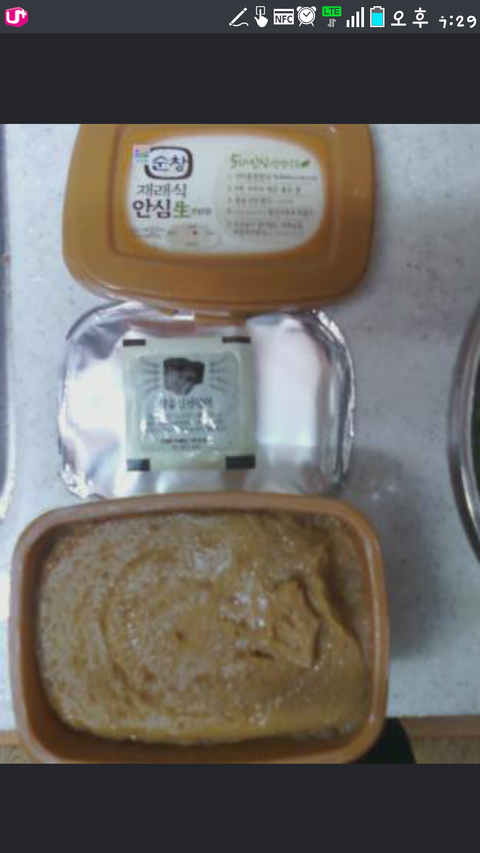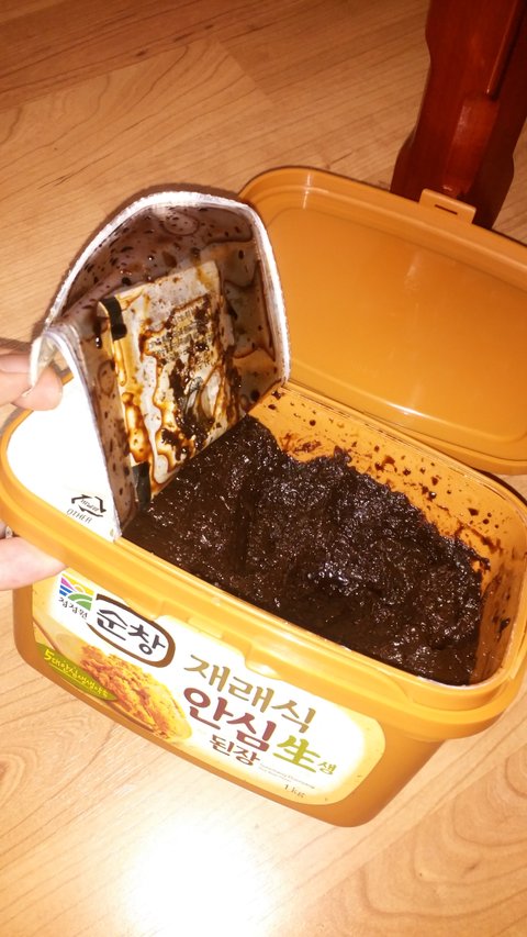 된장 색이 갈색 비슷하게 먹고 싶어지는된장이 들어 있을줄 알았는데 춘장색같이 검은 색이 들어 있습니다!!!