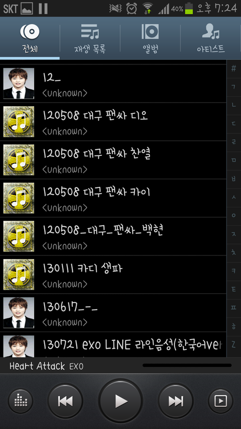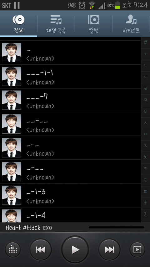 왜때문에 다 민석이 사진으로나오는지 나는몰라유ㅋㅋㅋㅋㅋㅋㅋㅋㅋㅋㅋㅋㅋㅋㅋㅋㅋㅋ큐ㅠㅠㅠㅡ그리고 노래가 400개정도있는데 85%가 엑소노래,음성임ㅋㅋㅋㅋㅋㅋㅋ큐ㅠ설렘송 공부송이런거 버스에서 뒷사람이볼까봐 쪽팔려서 못킴ㅠㅠㅋㅋㅋㅋㅋㅋㅋㅋ친구들도 노래목록 못보게해...