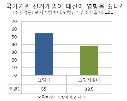 국가기관 대선개입 정황과 증거가 속속 드러나며 지난 대선을 부정선거로 인식하는 국민들이 늘어나고 있다. 지난 1일 전국 성인 800명을 대상으로 ‘노컷뉴스-포커스컴퍼니’가 실시한 여론조사에 의하면 응답자의 55%가 ‘국가기관 선거개입이 18대 대선에 영향을 미쳤다’고 답했다. 아니라고 대답한 경우는 38.5%였다.