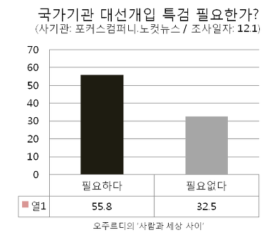 민주당 등 야권이 주장하는 국가기관 대선개입 특검에 대해서도 ‘필요하다’는 응답이 55.8%로 ‘필요없다’(32.5%)고 답한 비율보다 압도적이었다.