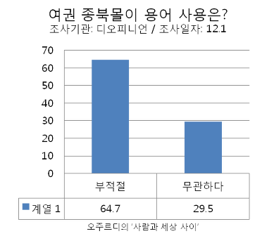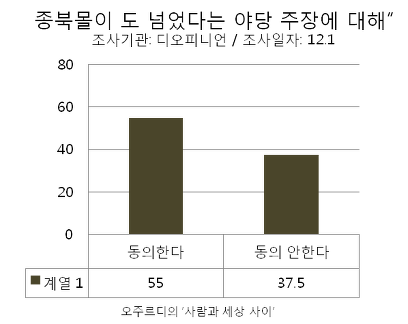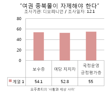 지난 1일 여론조사기관 ‘디오피니언’이 실시한 여론조사에 의하면 국민 2/3가 여권이 더 이상 종북 몰이를 해서는 안 된다고 생각하고 있는 것으로 나타났다. ‘이념논쟁을 촉발하는 종북 용어를 사용하면 안 된다’는 대답이 64.7%에 달했다.