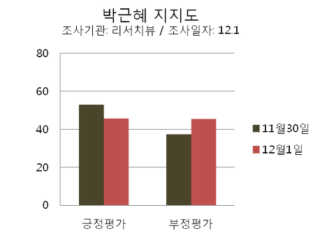 지난 1일 실시한 여론조사에서 나타난 지지도는 45.7%. 이는 10일 전인 11월20일 조사결과(52.8%)에 비해 7.1%포인트 낮아진 것이다. 박 대통령에 대한 부정적 평가는 37.4%(11.20)에서 45.3%로 7.9%나 급등했다.