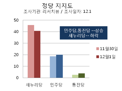 대통령 지지율은 여당 지지율에도 영향을 미친다. 직전 조사에 비해 새누리당 지지율은 45.8%에서 40.8%로 5.0% 낮아진 반면, 민주당과 통진당 등 야당 지지율은 상승세를 보였다.