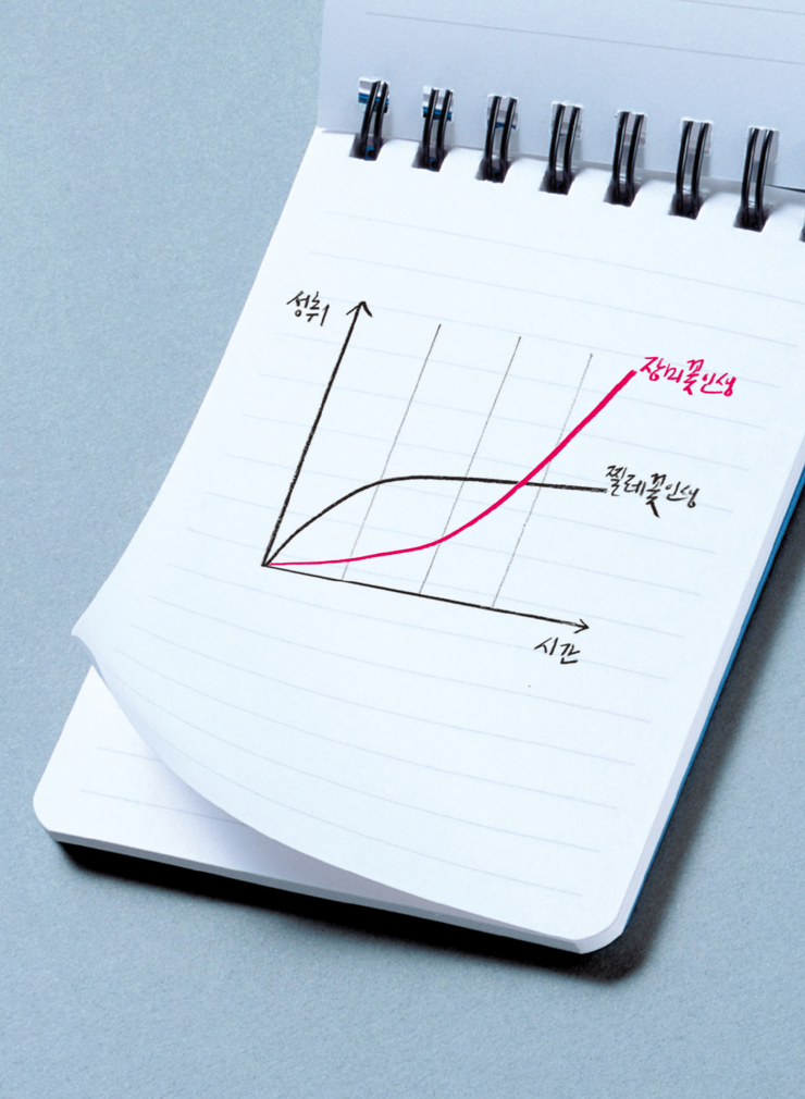 “그림으로 그리면 이쯤 되겠지. 인생 초창기부터 괜찮은 성취를 내면서 막판까지 순탄하게 가는 찔레꽃 같은 인생이 있고 처음에는 고생을 하지만 나중에는 화려한 비약을 하는 장미꽃 같은 인생이 있는 거야.”