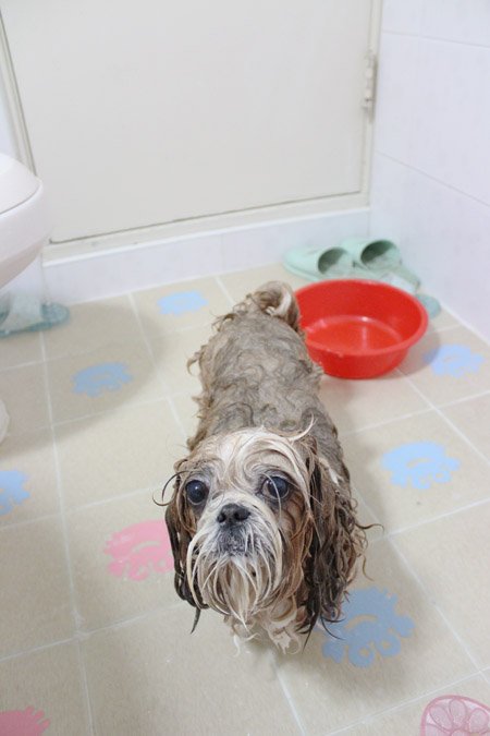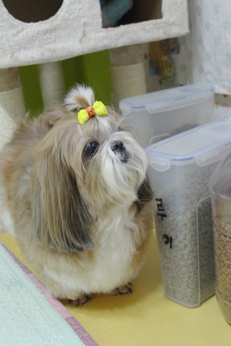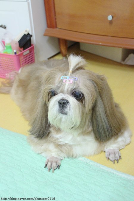 능금이 피부는 아주 안 좋습니다. 시츄에게 흔하게 나타나는 지루성 피부.. 그래서 3일에 한번 씩 목욕을 시키는데 요 녀석이 도와주질 않아요~ 집에 사람만 없다 싶으면 쓰레기통 뒤지고, 몇일 전에는 토마토를 먹었는지 구토까지하고 사람이 사용하는 화장실에서 대소변을 보는데 털이 많이 길어서 항상 화장실만 갔다오면 입 주변에서 냄새도 나고 지저분해서 배변판을 사줫더니 쓰지를 않네요.. 배변 유도제를 사용해보기 전에 능금이 소변을 패드에 묻혀서 훈련을 시켜봐야겠습니다