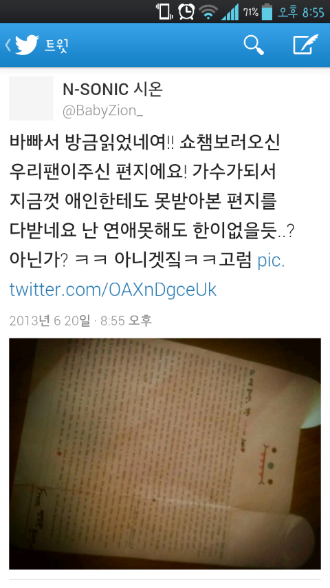 시온 트위터예요! ㅎ ㅠㅠㅠ 편지받고 감동머거쪙ㅠㅠㅠㅠ
