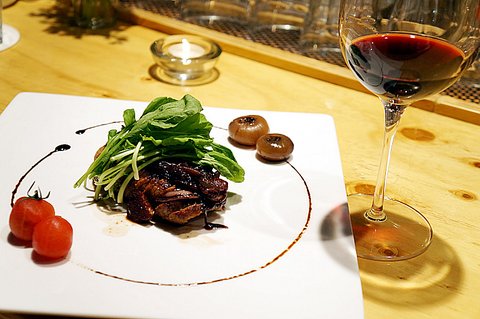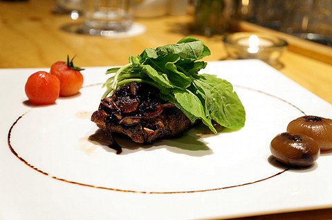 '레드와인 소스의 루꼴라를 곁들인 돼지 안심구이' 입니다.