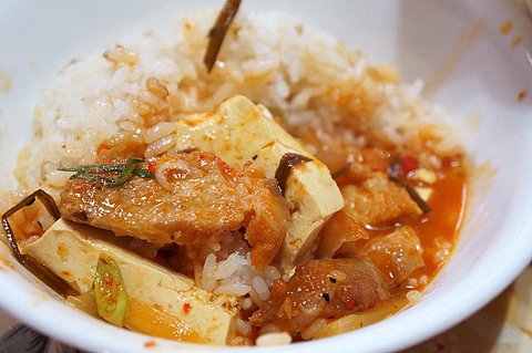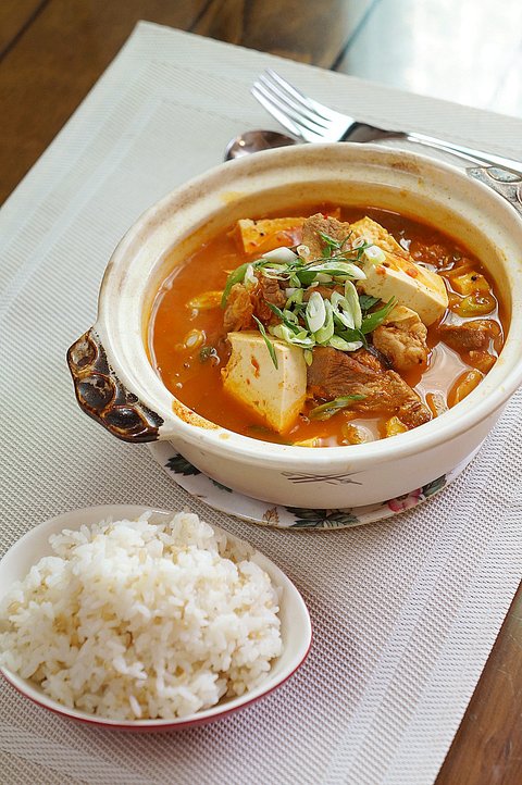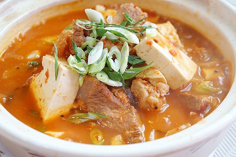 돼지고기와, 소세지, 남은 김치와 토마토 소스를 넣고 끓인 찌개입니다.