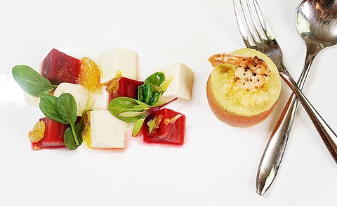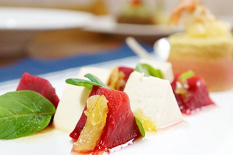 차가운 비트, 날치알과 새우를 곁들인 계란찜