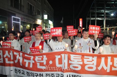 12월 4일, 천주교정의구현전국사제단은 전주교구 사제단이 시국 미사를 열어 박근혜 대통령의 사퇴를 촉구한 지 12일 만에 공식 입장을 내고 "불통과 독선, 반대 세력에 대한 탄압으로 일관하는 공포 정치의 수명은 그리 길지 않다"고 밝혔다. 이어 "지금이라도 이 모든 것의 책임을 지고 스스로 물러남이 명예로운 일이다"라고 밝히고 나섰다.