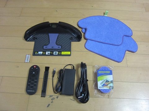 동그란 모양의 로봇청소기와 로봇청소기의 부속품들입니다~ 이 로봇청소기는 먼지흡입도 하고