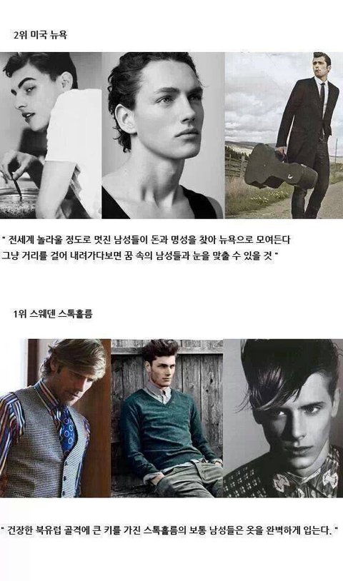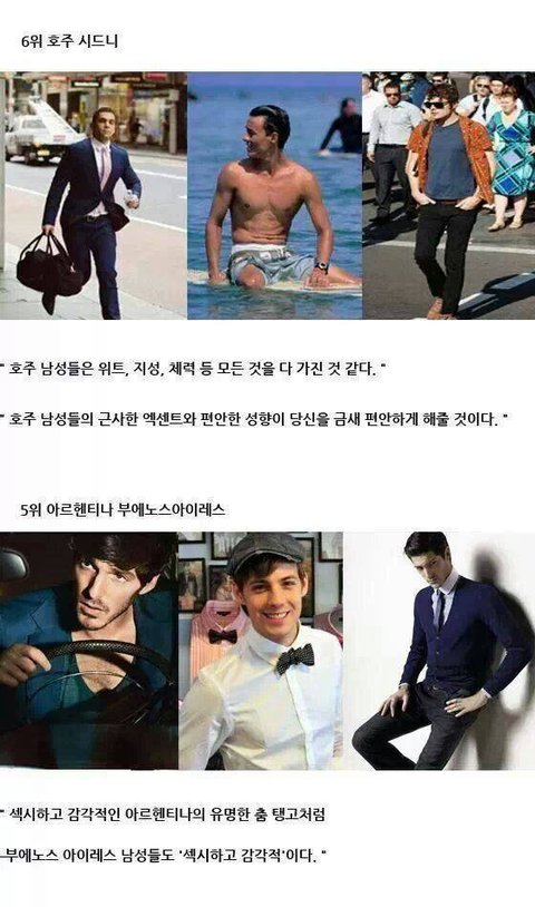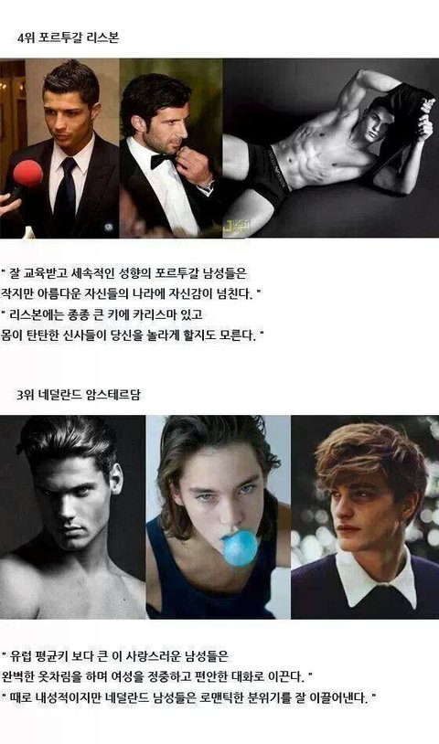 물론 성형,화장덕분도 있지만 그래도 우리나라 여성들은 세계순위권10위안에 들었는데 남성은 순위권안이 아니잖아 제발 여자보고 김치녀 보지어쩌구 한국녀들은역시 서양에 발끝도못미친다 우크녀가짱이다 이런자신에조국여성을 폄하하는 말좀 안했으면 좋겠다 같은나라사람끼리 뭘그렇게 할뜯고 욕하는건지; 그리고 어쨌든간에 저기순위권에 있는 남자들보다 내나라한국남자들이 더멋있고 매력있다고 생각함. 그러니까 말조금만 더 고급스럽게 해주면 정말 좋을것같음