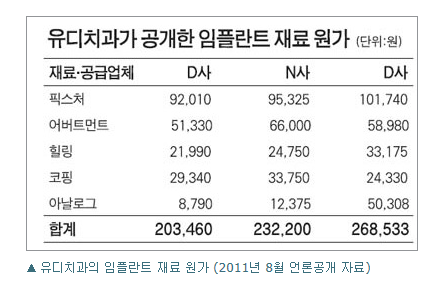 2011년 8월에 유디치과가 언론에 공개한 임플란트 재료원가에 따르면