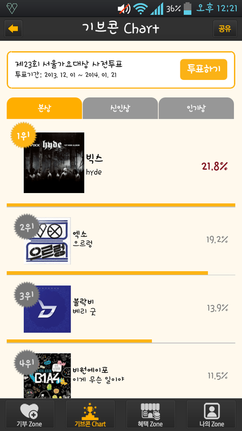 (100%반영)지금본상순위에서는엑소가 2위고1위랑 2%차