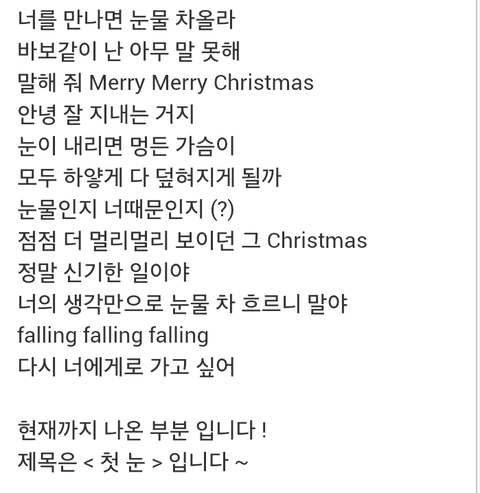 하이라이트 메들리에서 나온 첫곡 듣자마자 꽂혔음...나 솔직히 솔로고 이번 클쓰마쓰도 혼자 보낼꺼같은데 왠지 저 노래 들으면 맘이 따뜻해져서 혼자라도 기분좋은 클쓰마쓰 보낼꺼같음ㅎㅎㅎ 얘들아 미리 고마워 솔로인 나를 즐거운 크리스마스로 만들게 해줘서ㅋㅋㅋ ㅠㅠ