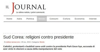 ‘한국: 종교와 대통령의 대립-South Korea: religions against president’라는 제목의 이 기사는 ‘가톨릭, 개신교, 불교인들이 선거조작을 통해 대통령에 당선된 혐의를 받고 있는 박근혜 대통령에 대항하여 하나로 뭉쳤다’며 종교인들의 입장은 ‘안보기관인 국정원이 박근혜 후보가 이기도록 국민들에게 압력을 행사했을 것이라는 것이다. 실제로 국정원은 결과를 조작했을 수도 있다’는 것이라고 전했다. 이 기사는 박근혜는 선거의 투명성을 강조하며 이 선거에서 어떤 빚도 지고 있지 않다고 하지만 최초의 여성 대통령이라는 의미가 선거의혹으로 인해 많이 퇴색됐고 심지어 현 대통령의 아버지 박정희 시대의 독재가 다시 돌아온 듯하다고 한국의 상황을 전하며 “지난 대선에서의 ‘진실을 밝히기’와 박대통령 사퇴요구로 긴장은 최고조에 달하고 있다”고 보도했다.