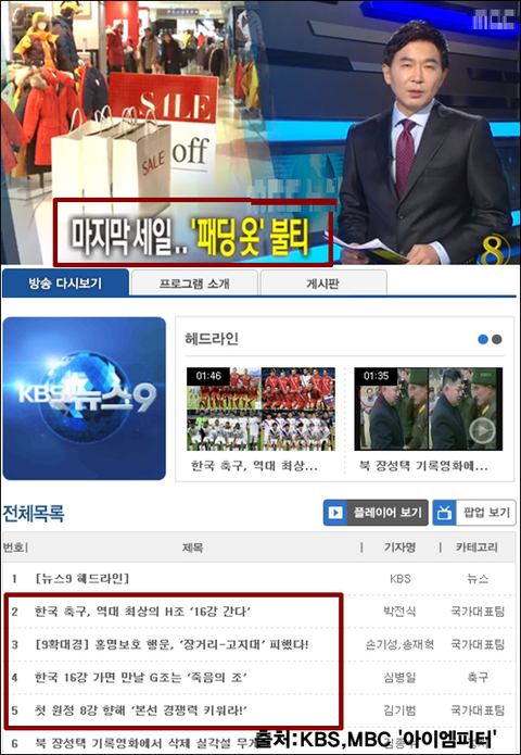 MBC는 수만 명의 시민들이 거리에 나와 물대포를 맞고 있는 상황에서 <백화점 마지막 세일. '패딩 옷'불티, 한숨 돌렸다>는 뉴스를 보도했습니다. 백화점의 정기세일이 부진했는데 마지막 세일에 손님이 몰리면서 한숨을 돌렸다는 내용입니다.
