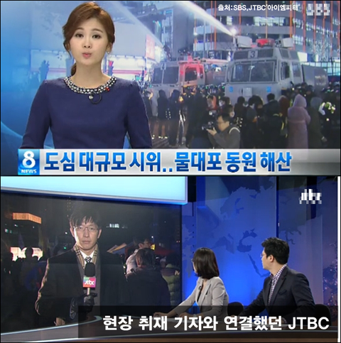 KBS와 MBC와 비교하면, SBS는 <도심 대규모 시위..물대포 동원 해산>이라는 시국대회 소식을 1분 39초 동안 보도했습니다. JTBC는 7일 시위 현장의 취재 기자를 연결해 소식을 전한 이후, 8일 뉴스에서는 경찰 물대포 대응 또한 보도했습니다.