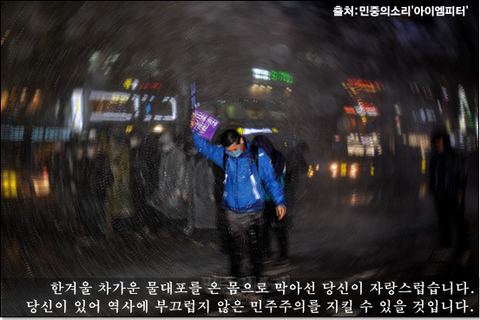 한겨울 차가운 물대포를 온몸으로 막아선 당신들이 자랑스럽습니다. 당신이 있어 역사에 부끄럽지 않은 진짜 민주주의를 지킬 수 있을 것입니다. 고맙습니다.
