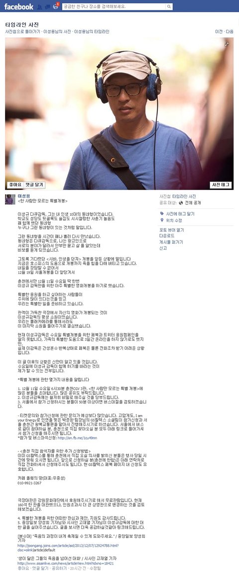 현재 이성규 감독은 수요일 특별개봉을 위한 페북과 트위터 응원캠페인을 알지 못합니다.