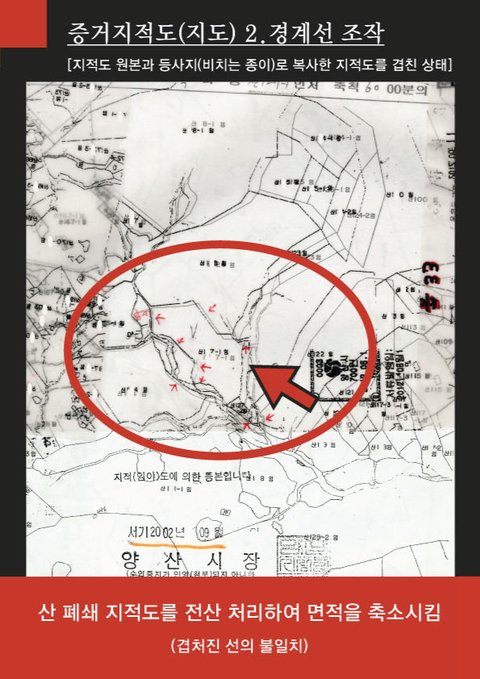 그 이후 양산시 지적과 도로과 대한지적 공사 측량기사 7명(측량감정 7회)이 담합하여 지적도를 조작하였습니다.