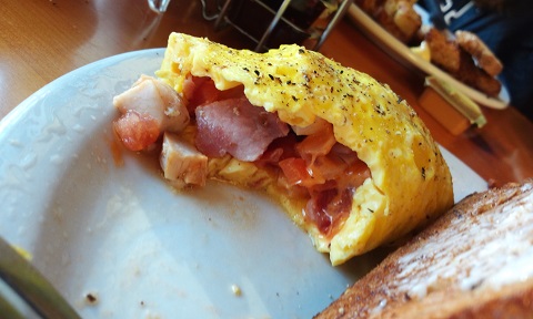 오믈렛 안에는 햄, 토마토, 치킨을 선택해서 넣었어요!