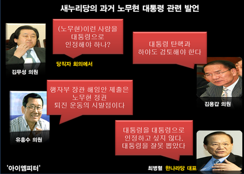 김무성 새누리당 국회의원은 2003년 9월 3일 한나라당 당직자 회의에서 "노무현이를 대통령으로 지금까지 인정하지 않고 있다"고 발언했습니다. 김무성 의원은 의원총회 내내, 노무현 대통령을 노무현이라고 지칭했습니다.
