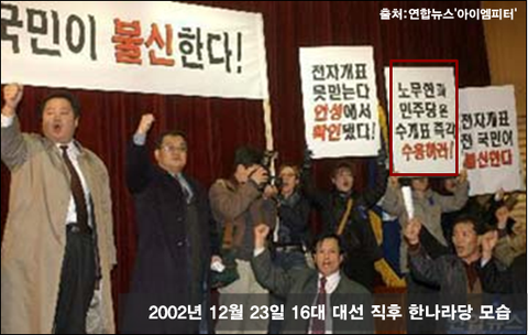 2002년 제16대 대통령 선거가 끝나자마자 한나라당 지지자들 사이에서는 '개표 조작설'이 나돌았습니다. 12월 23일 한나라당 중앙선대위 해단식에는 한나라당 당원과 지지자들이 몰려와 수개표를 요구하는 시위를 벌였습니다.