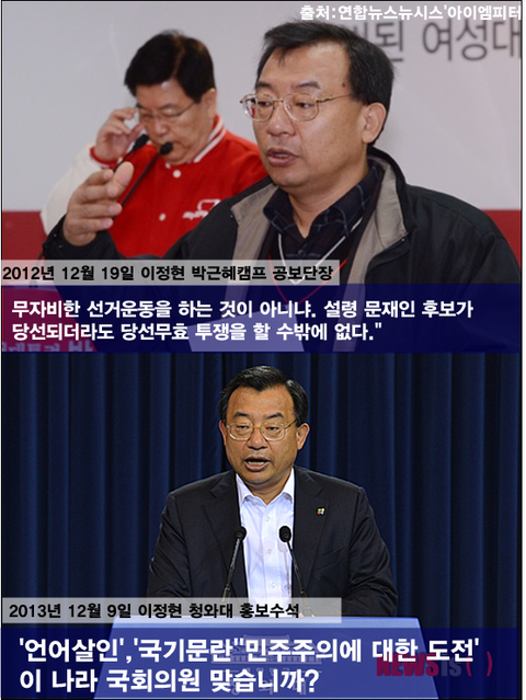 2013년 12월 9일 청와대 이정현 홍보수석은 양승조 민주당 국회의원과 장하나 의원의 발언에 대해 <언어살인,국기문란, 민주주의에 대한 도전>이라며 "이 나라 국회의원이 맞습니까?"라고 했습니다. 불과 1년 전에 자신이 했던 말은 까맣게 잊고 뻔뻔하게 이런 말을 하고 있습니다.