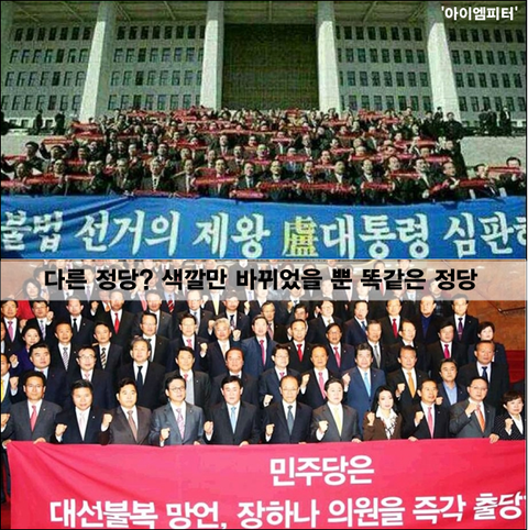 대선불복 망언이라며 장하나 의원을 출당하라고 국회 앞에서 현수막 들고 사진 찍었던 새누리당 국회의원들은 과거에 노무현 대통령을 불법선거의 제왕이라며 사진 촬영을 했던 바 있습니다.