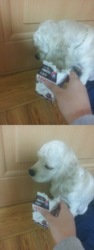 초코우유 팩 뜯어서 혼나는중에...너무 불쌍한척하는.......동정심을 유발하구요..