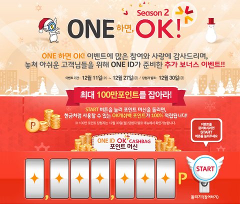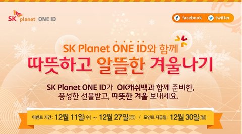 이벤트는 바로 SK플래닛 ONE ID에서 하고 있는 이벤트예요~ 이벤트 기간은 12월27일까지고 다양한 이벤트가 진행중이예요 모두 다 참여만 하면 OK캐쉬백 100% 제공에 따로 추첨을 통해 빅경품을 준데요