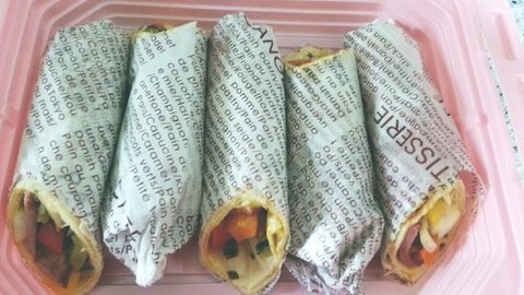 훈제오리 볶아서 파프리카,피클,토마토,머스타드 소스 삭삭 발라서 또르르르
