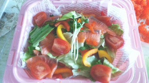온갖 야채 쓱쓱 짤라서 사이사이 연어 투척