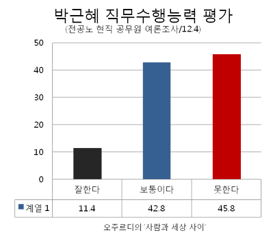 박 대통령의 제왕적 모습에 많은 이들이 실망하고 있는 것으로 나타난다. 전국공무원노조가 지난 11월 23일부터 29일까지 현직 공무원 7366명을 대상으로 실시한 설문조사에 의하면 박근혜 정권의 직무수행능력에 대해 ‘잘한다’고 평가한 답변은 11.4%에 그쳤다.