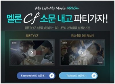 이벤트 페이지에 있는 멜론 TV CF를 페이스북이나트위터에 소개하면 참여 완료.