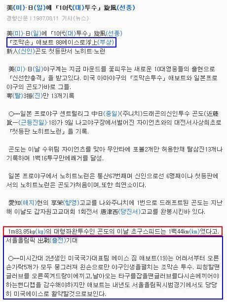 만 19세였던 애보트가 87년부터 88올림픽 미국 대표팀 에이스로 예상되었고, 주니치 신인 투수 곤도(만 18세)가 데뷰전에서 노히트 노런을 기록했으며 초구 스피드가 144km였다는 내용을 확인할 수 있는데,