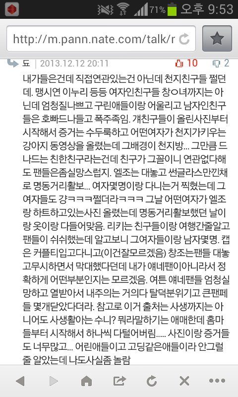 천지 친구들 질 나쁜건 뭐라 할 수가 없다 그건 개인 사생활 문제니깐. 그래서 팬들이 친구한테 개인 연락은 되도록이면 메신저나 문자같이 안보이는 곳에서 하라고 계속 말하고 있는 중이고 요즘에는 좀 줄었고.