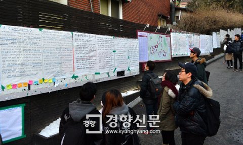 주씨가 쓴 고려대 대자보 옆에는 화답 게시물 40여건이 연달아 붙었다. ‘안녕들하십니까’라는 이름으로 개설된 페이스북 페이지(facebook.com/cantbeokay)