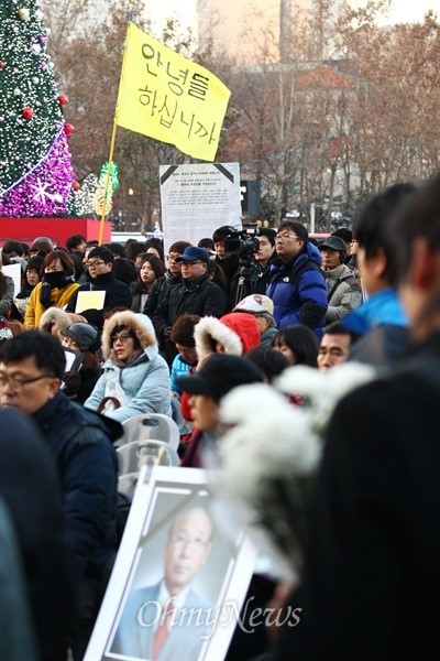 ▲ '밀양할머니 안녕들하십니까?' 철도민영화 반대하는 고려대 학내 대자보 '안녕들하십니까'를 지지하는 '서울역나들이' 참가자들이 14일 오후 서울 시청광장 앞에서 열린 밀양송전탑 반대 주민 '고 유한숙씨 추모 문화제'에 참가하고 있다