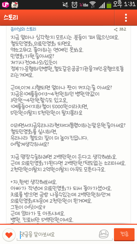 철도민영화 의료민영화 한 번만 관심 가져주세요. 우리 나라의 일입니다. 지금 관심을 가져야 하는 것은 연예인이 아니라 우리나라의 일입니다.