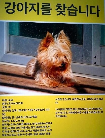 라디오 스타에서 나왔던 통키라는 강아지인데 혹시 통키를 보신분 꼭 이 연락처로 연락주세요!!