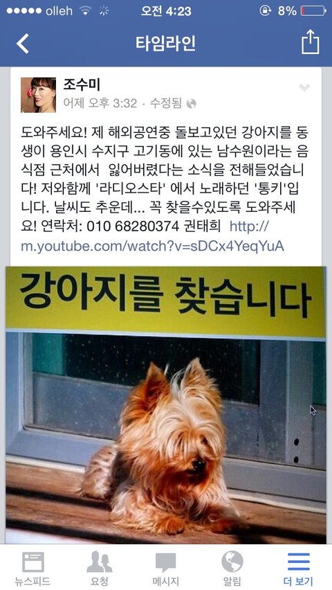 성악가 조수미님이 강아지 통키를 잃어버리셨데요ㅠㅠ 도와주세요!!
