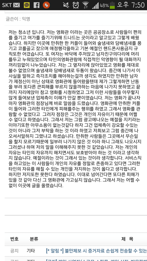 오늘 친구와 같이 영화를 보러 갔다가 이해할 수 없는 일을 겪여서 다른사람들도 이런 피해를 당하면 어쩌나 싶어 소비지고발센터에글을 올렸습니다.그리고