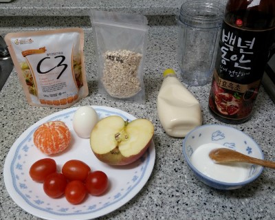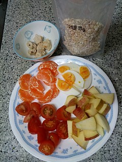꼬꼬빌 닭가슴살 C3 / 뮤즐링 오트밀 / 그 외에 냉장고 재료들 ( = 귤 . 방토 . 사과 . 삶은 달걀 )