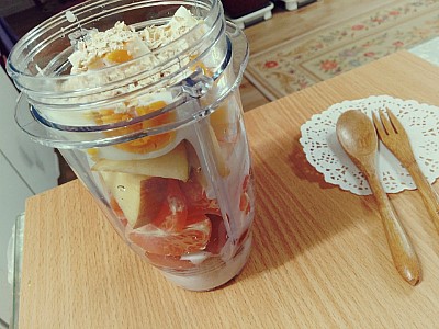 먹기 좋은 크기로 잘라줍니당 ~( 황도 대신 귤 ! 오이 대신 사과 ! )