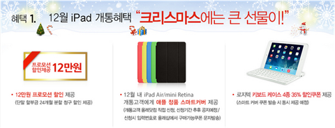 올레닷컴은 아이패드 개통 혜택으로 단말기 할부요금 청구시 12만원 할인과 애플 정품 스마트 커버, 로지텍 키보드 케이스 4종 할인쿠폰 제공 등 다양한 선물을 제공하고 있는데요. 무엇보다도 스마트 커버가 가장 욕심이 나네요. ㅎㅎ