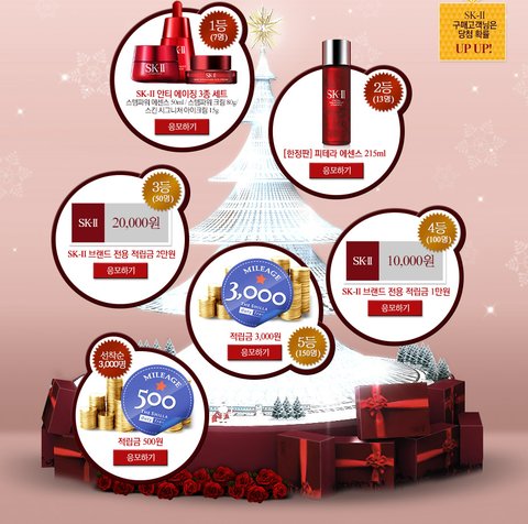 1등 - SK-ll안티에이징 3종세트 (7명)2등 - SK-ll피테라에센스 (13명3등 - SK-ll브랜드 전용 적립금 2만원 (50명)4등 - SK-ll브랜드 전용 적립금 1만원 (100명)5등 - 적립금 500원 (선착순 3,000명)