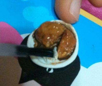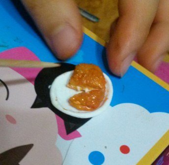 2.하얀 천사점토를 저렇게 얇게만든후 아까 만들었던 두개의 돈까스중 하나의 돈까스위에 올리고 다시 다른돈까스조각으로 덮습니다 ( 치즈돈까스를 만들기위해 치즈로 사용됩니다 )
