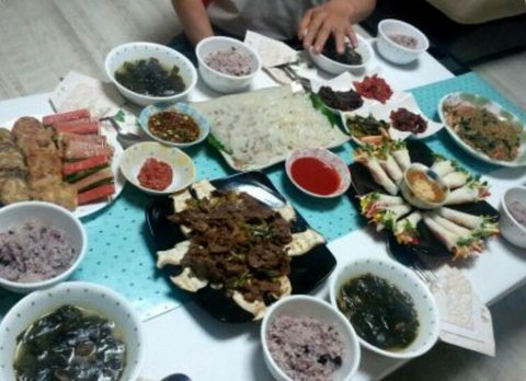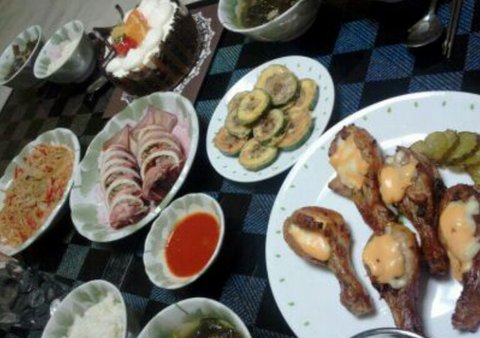 미역국에 닭다리 치즈구이와 오징어순대, 소고기호박전, 매콤잡채 !